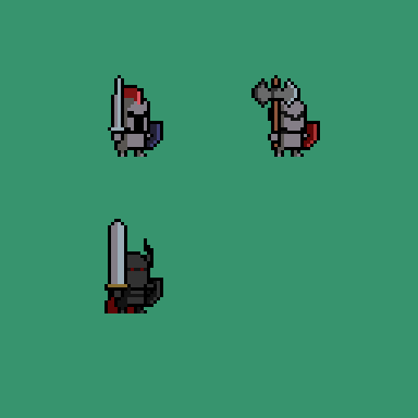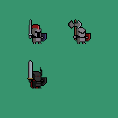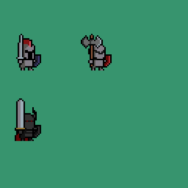 I really like the animations! Most of them are very smooth. I'd recommend giving the weapon swings a few extra frames though so that they don't immediately go back to being upright. I'dd also add some highlights to the armor, make 'em look shiny! The weapon wobbling for the death animations is a really nice touch though, and the way cycles are hella smooth! (Great job with the cape flowing for the black knight!)